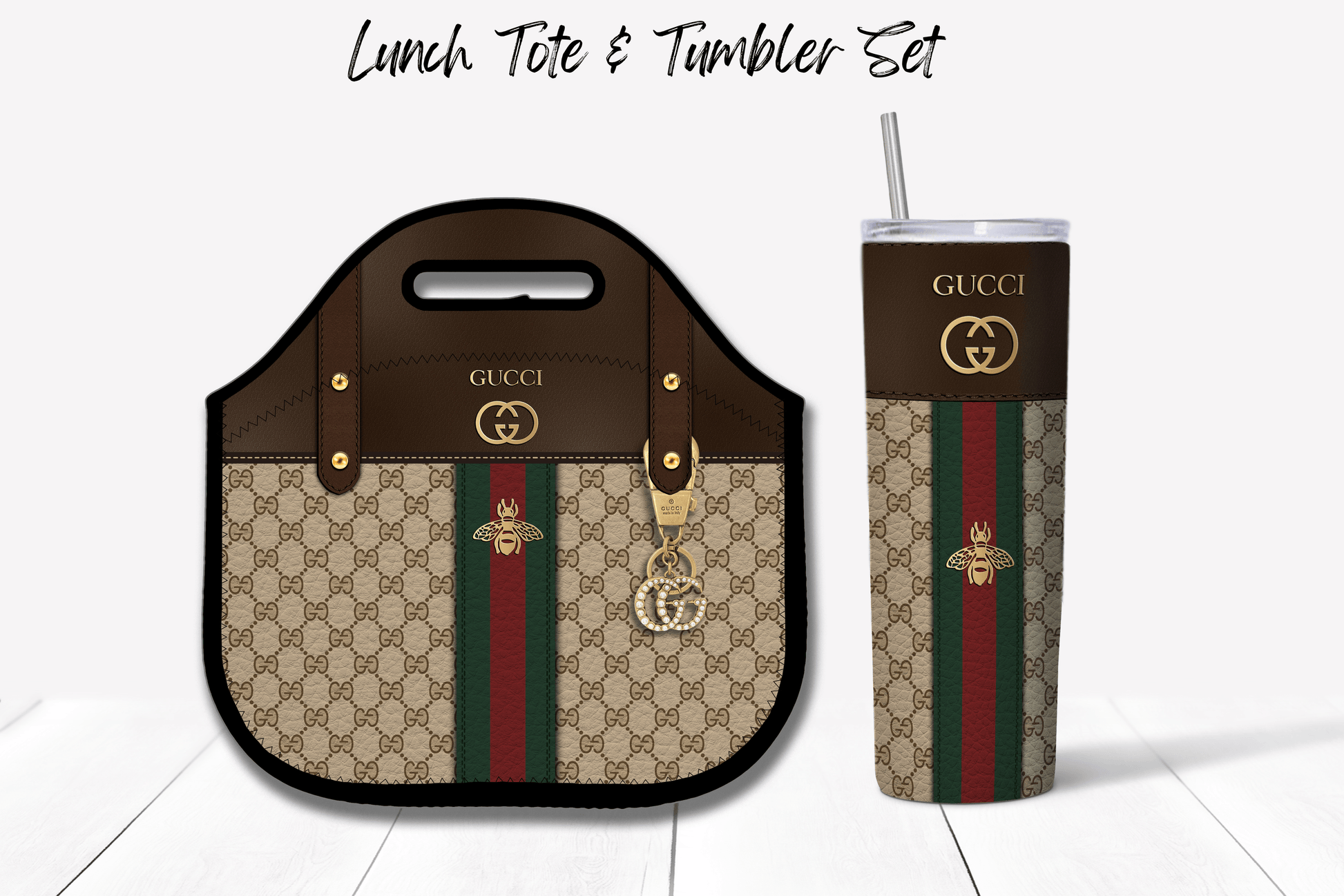 Gucci Dark Brown Monogram Lunch Tote and Tumbler Set Leather Texture