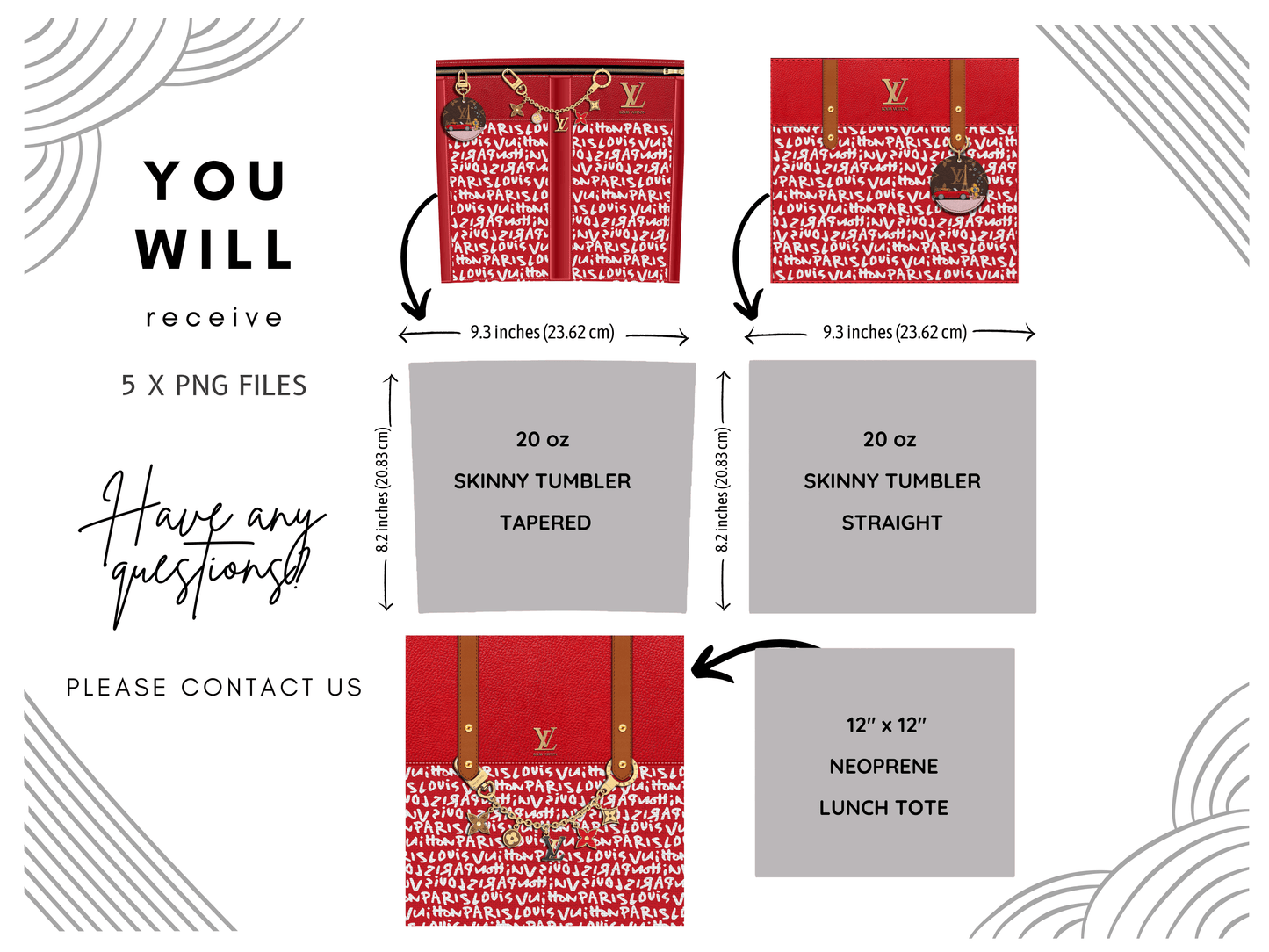 DIMENSIONS: All 20 oz Skinny Sublimation Tumbler Wrap Prints are 9.3inch x 8.2inch (standard 20oz skinny tumbler size). All Lunch totes are the standard size of 12" x 12".